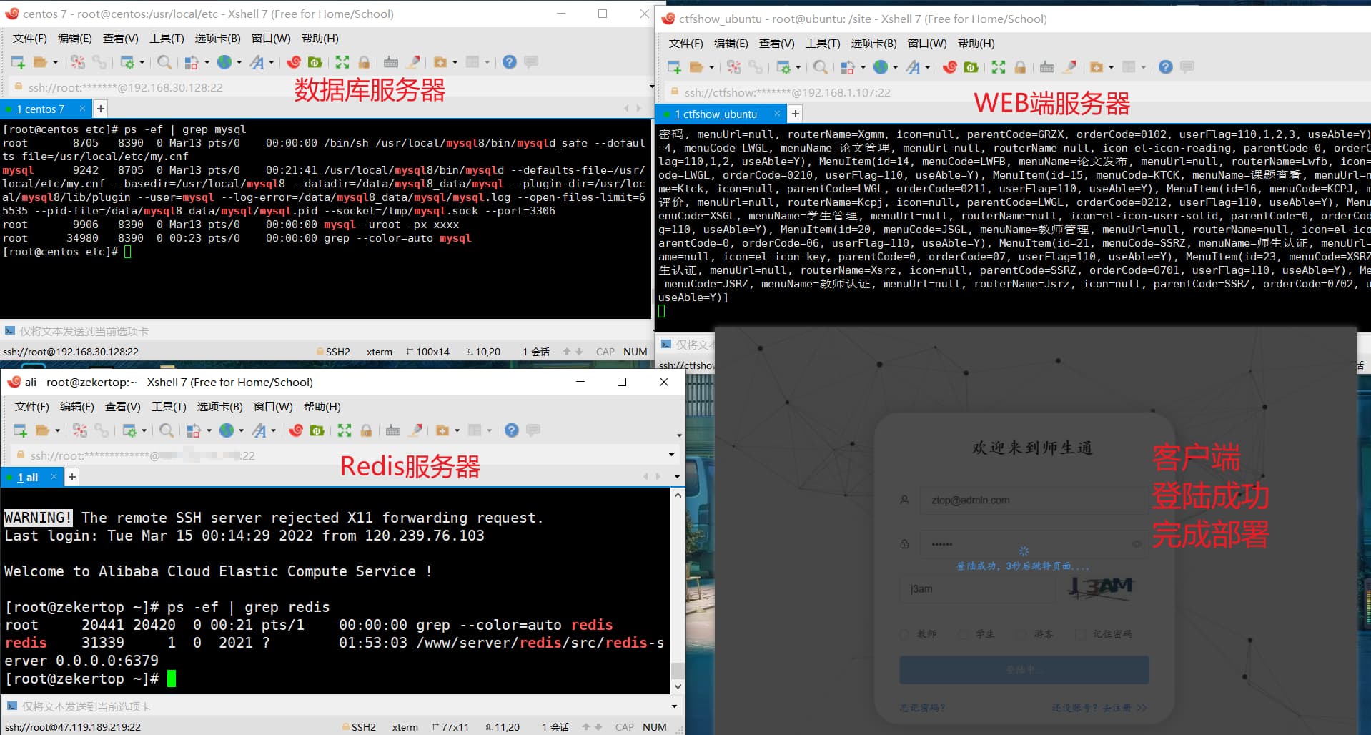 Ubuntu一台(用于存放前后端,及运行环境)Centos7两台(用于放置数据库和Redis)