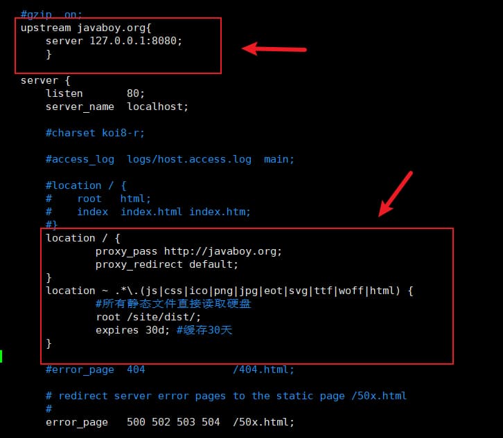 在/usr/local/nginx/conf/nginx.conf文件中添加代码,添加位置如下: