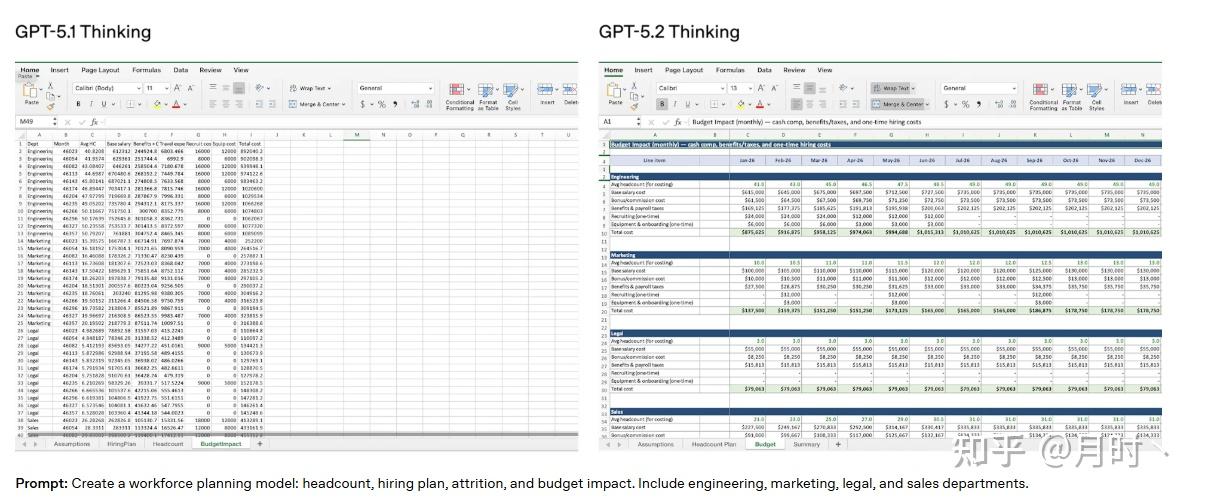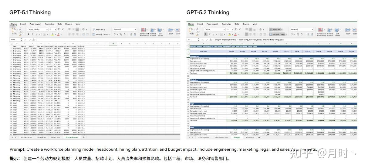 与GPT5.1相比,可以看出GPT‑5.2 Thinking 生成的电子表格和幻灯片在复杂度与格式呈现上的明显提升: