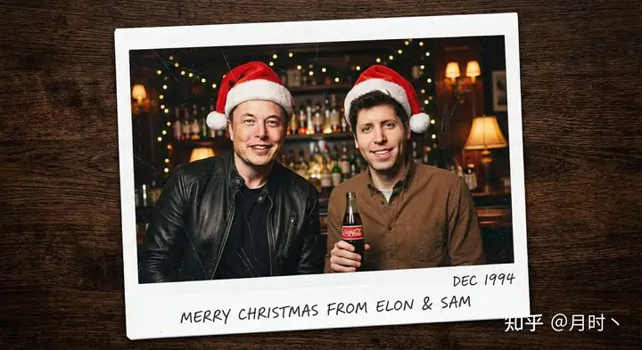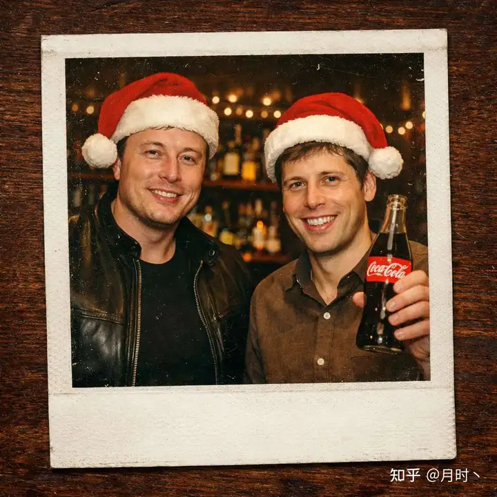 Prompt: 一张复古宝丽来风格的照片,带有标志性的白边框,平铺在一个深棕色纹理表面上。照片内是伊隆·马斯克(Elon Musk)和山姆·奥特曼(Sam Altman)的合影。两人都戴着红白相间的圣诞帽。马斯克在左侧,穿着黑色皮夹克,面带微笑。奥特曼在右侧,穿着棕色纽扣衬衫,微笑着举起一瓶复古玻璃瓶装的可口可乐,瓶身上有经典的红色标签。背景是一个光线昏暗的酒吧,背景有模糊的酒架、灯串和暖色调的灯光。照片表面有颗粒感和轻微的划痕。