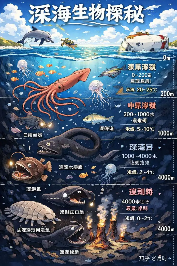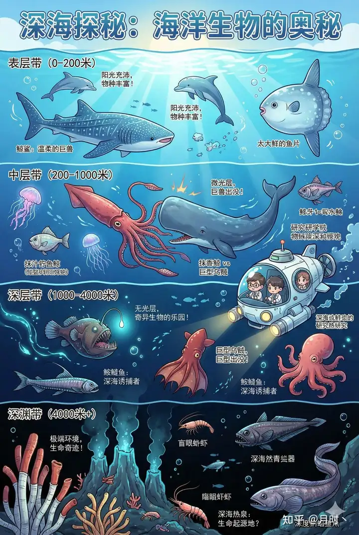 Prompt:做一张深海生物的海报,要展示不同深度的,图片为一个竖着的海洋剖面图,整体风格精细有趣,日系动漫风,中文解析