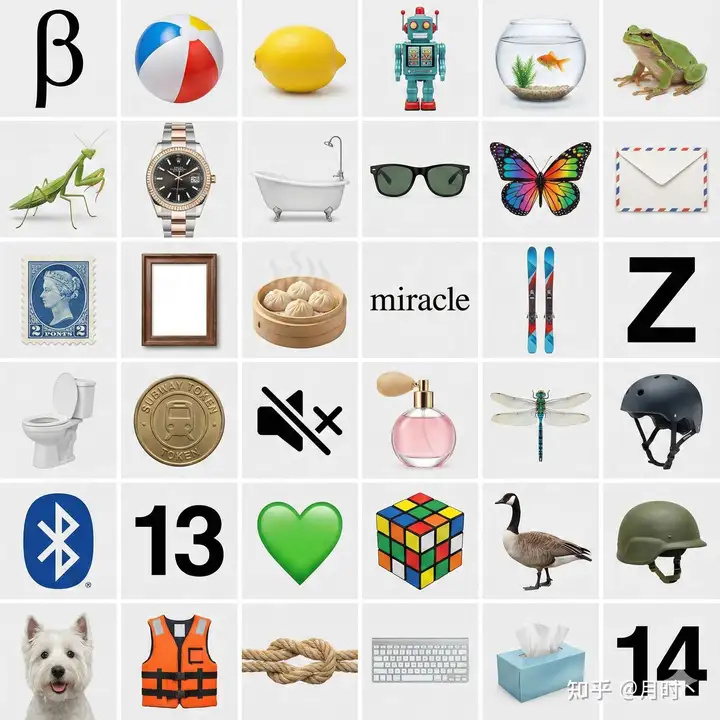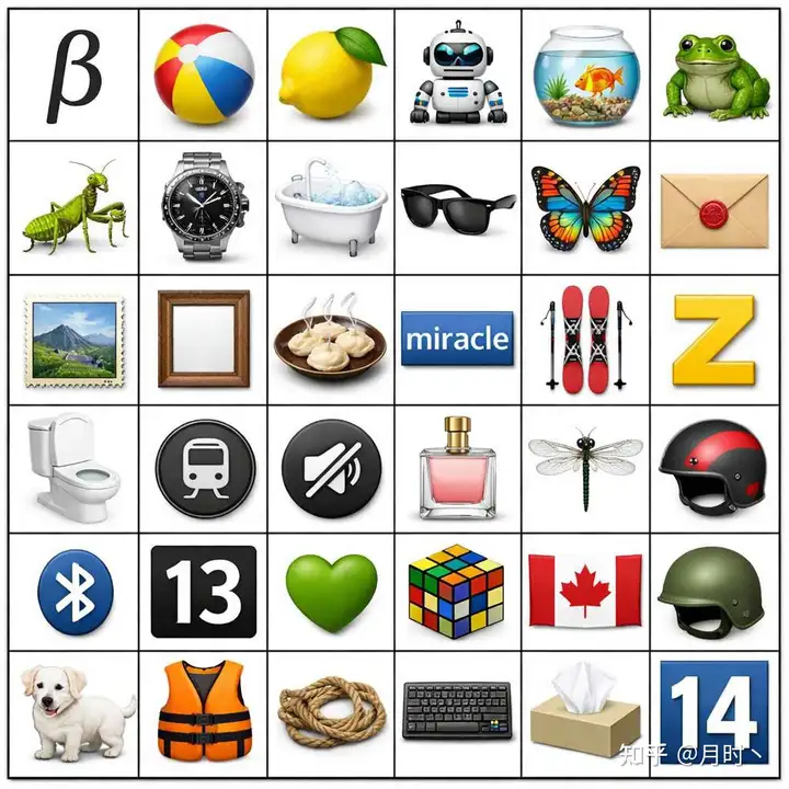 第1行:希腊字母β、沙滩球、柠檬、机器人、鱼缸、青蛙