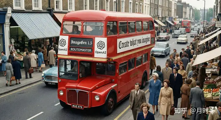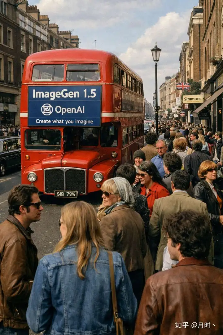 Prompt:做一个1970年代伦敦切尔西的街景,要那种照片级的写实,全焦,纤毫毕现。街上人山人海,还要有一辆公交车,车上有个广告写着「ImageGen 1.5」,再加上OpenAI的标题和副标题「Create what you imagine」。整体风格要超写实的业余摄影,就像iPhone随手拍出来似的…